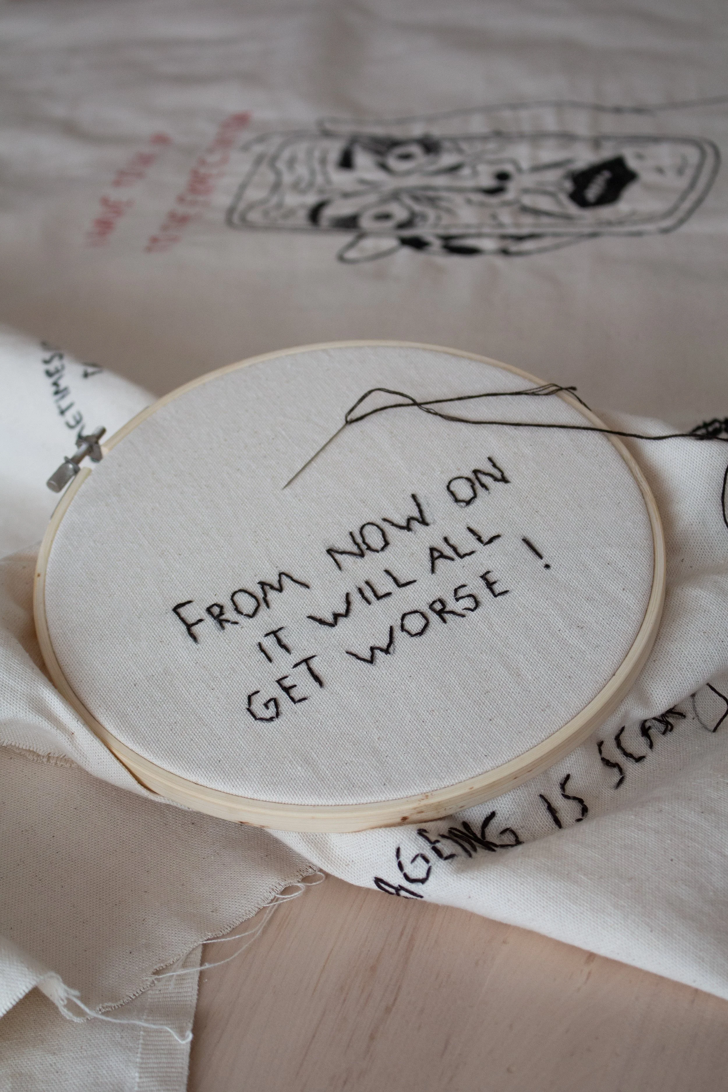Een deel van de quotes uit de enquête is met de hand geborduurd tijdens gesprekken met deelnemers, waarin we openlijk spraken over ouder worden en de onzekerheden die daarbij komen kijken.